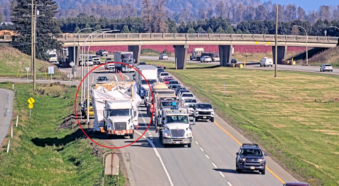 The truck, an Alberta-based carrier with a licensed load, was driving westbound in the left lane of Highway 1 carrying a modular home when it struck the No. 3 Road overpass.