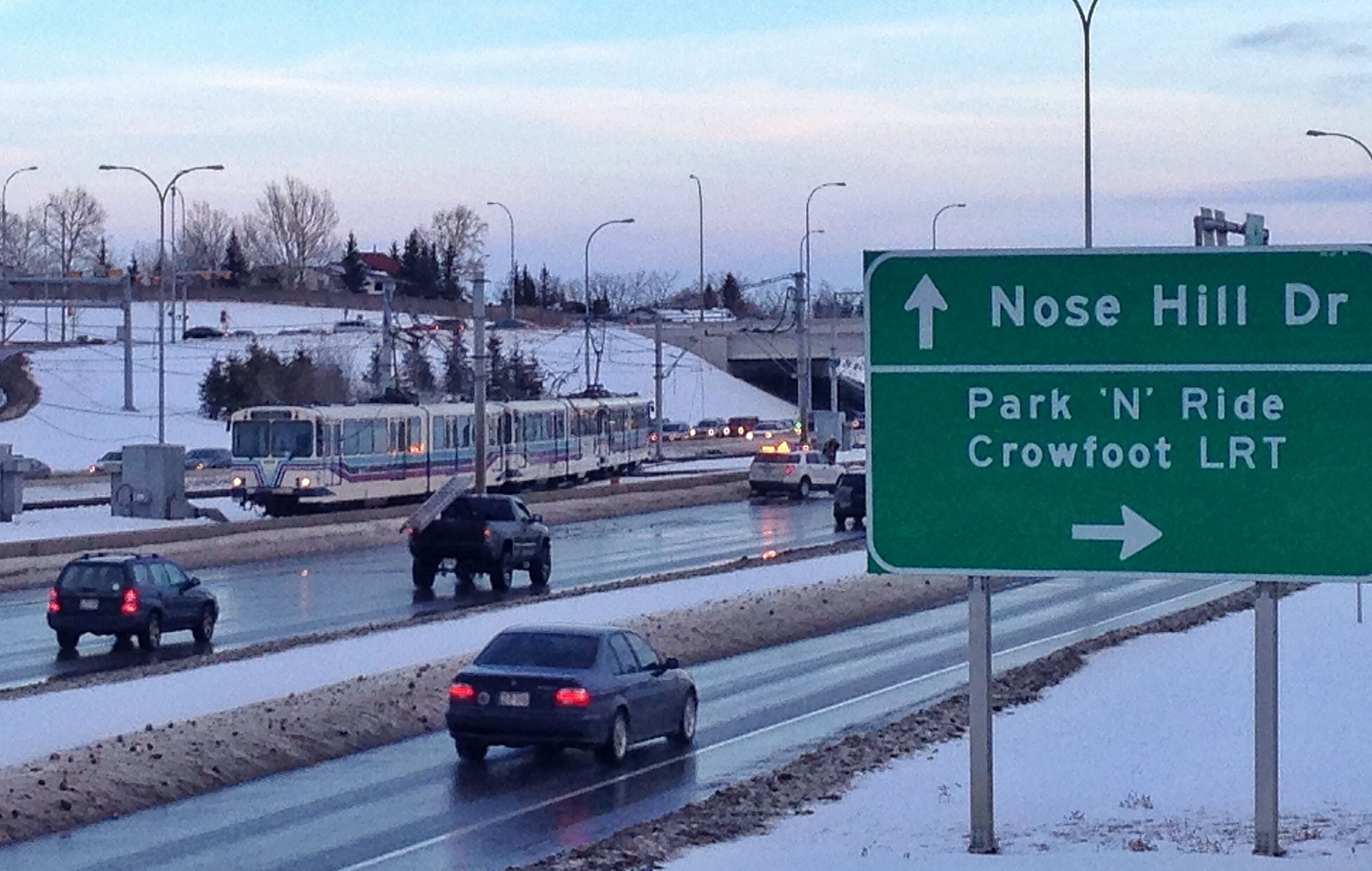 Around 3:30 p.m., some electrical wires along the LRT track fell down, and wrapped around a train near the Crowfoot station.