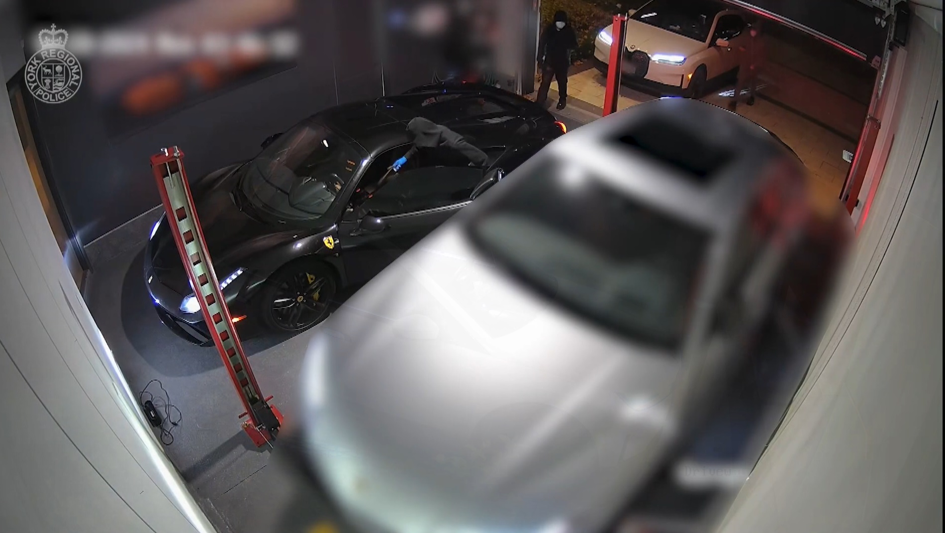 The suspects can be seen making off with the owner’s Ferrari and BMW, both of which were recovered later.