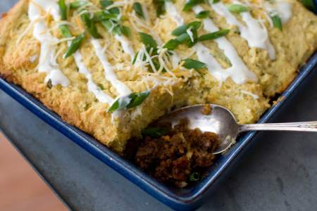 We drew our inspiration from shepherd’s pie and a Tex-Mex taco. The result is a casserole that starts with a layer of chili, then adds a layer of cornbread. After it has baked, the casserole gets finished with all the standard Super Bowl ingredients – guacamole, sour cream, shredded cheese and olives. You could even add some refried beans or shredded lettuce and pico de gallo.