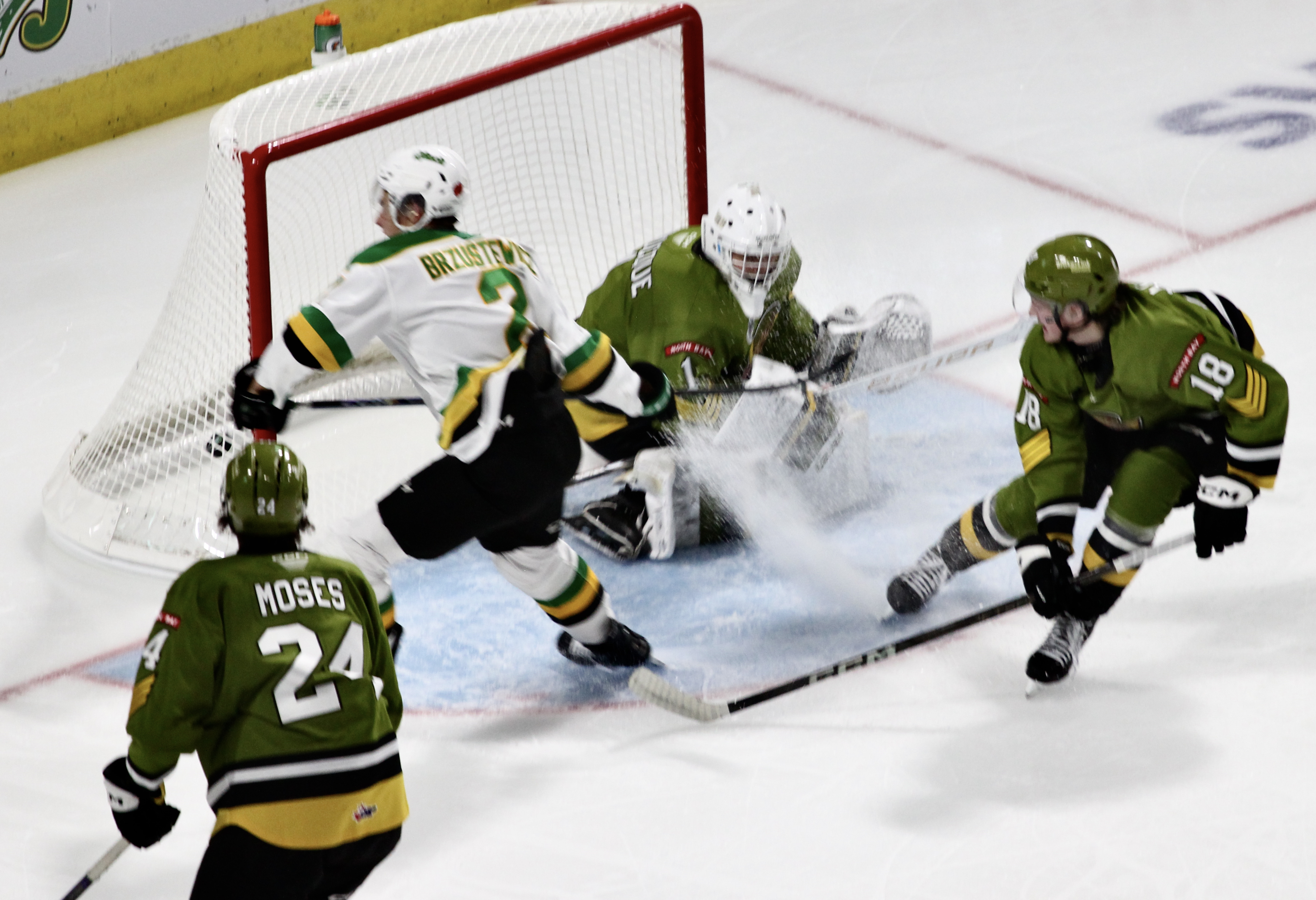 Brzustewicz connected on a slap shot and scored his first goal of the season just over five minutes later to double London’s lead. Dickinson then cashed in on another power play for his 10th goal in 14 games to make it 3-0.