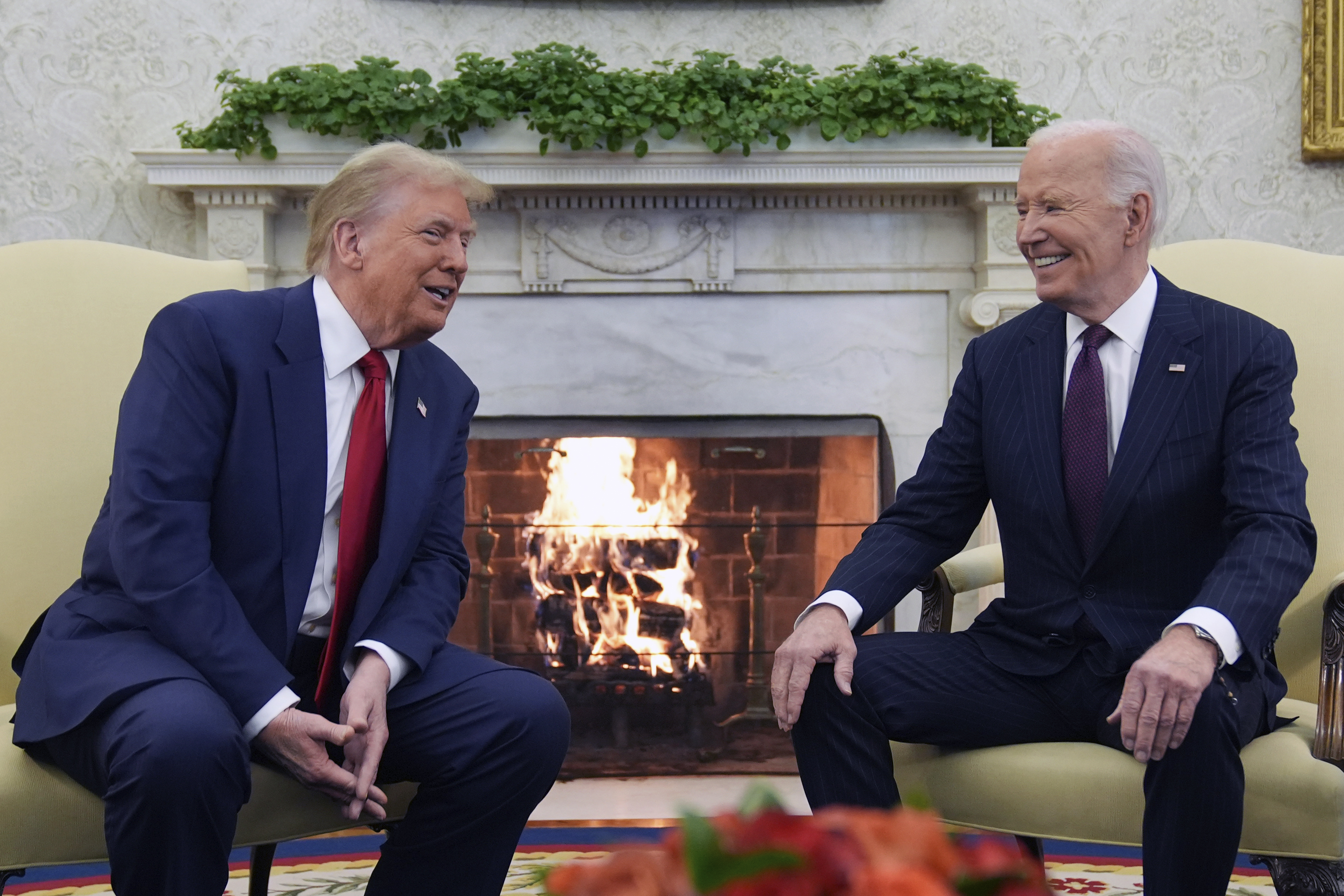 Sitting in front of a crackling fire, the rivals shook hands in the Oval Office as reporters looked on. Biden called Trump “Mr. President-elect and former president” before settling on “Donald.”