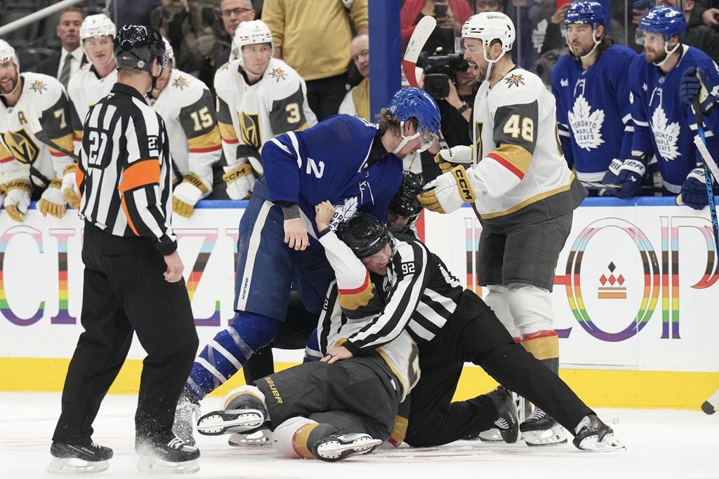 Both teams were without their captains with Toronto’s Auston Matthews (upper-body injury) missing his seventh straight game and Vegas’ Mark Stone (lower body) his sixth. The Leafs were also missing Max Domi, David Kampf, Max Pacioretty and Calle Jarnkrok while Ryan Reaves started his five-game ban for felling Oilers defenceman Darnell Nurse with an illegal check to the head.