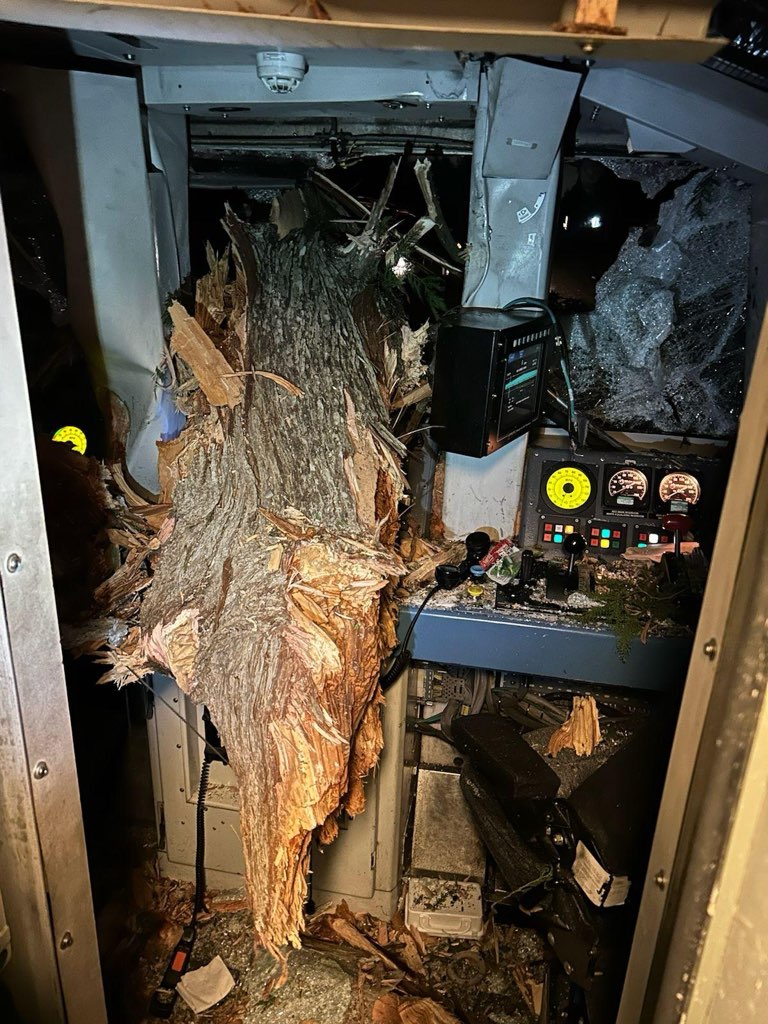 About 85 km north of Seattle a massive branch smashed right through the window of the cab car.