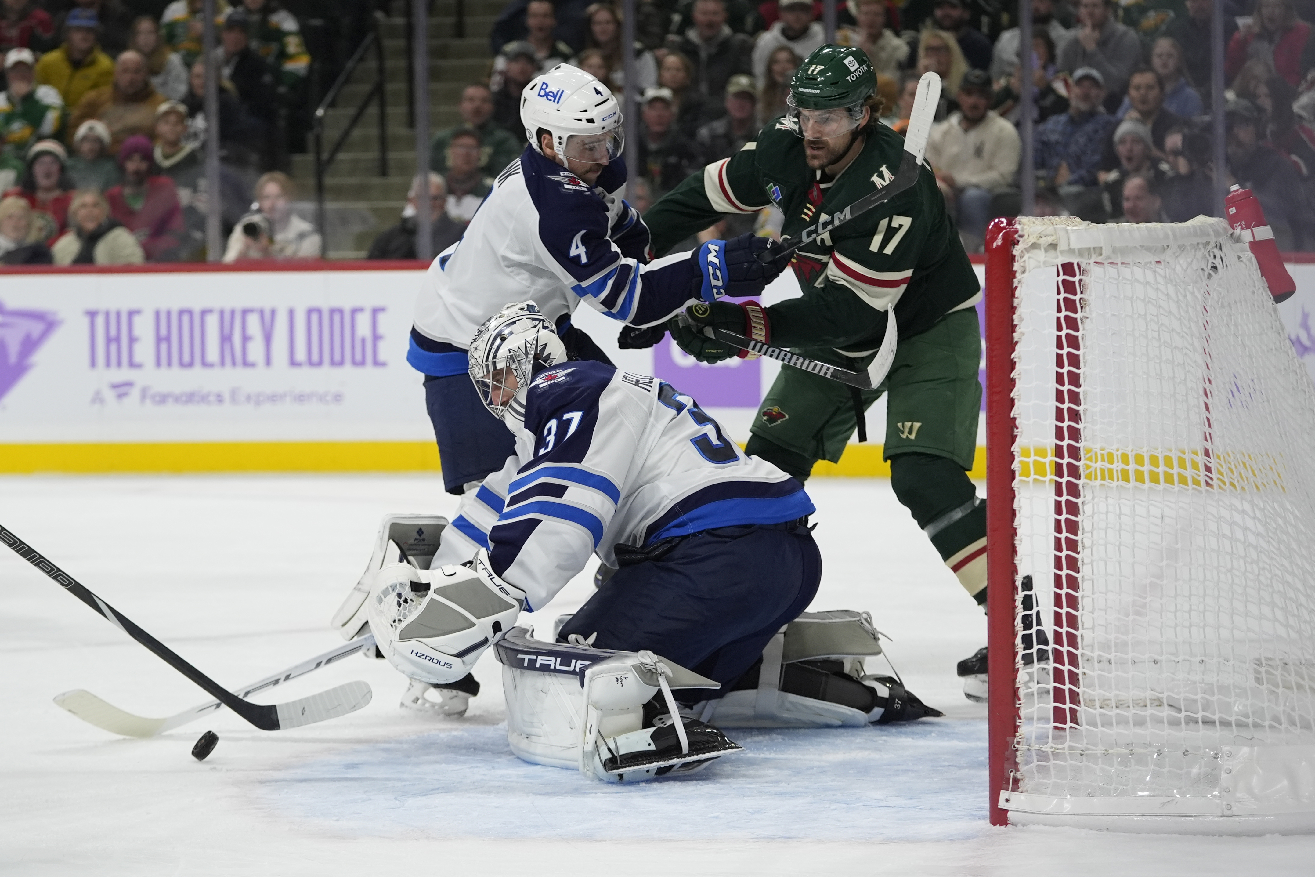 Connor Hellebuyck stopped 43 0f 44 shots as the Jets picked up a 4-1 win in Minnesota on Monday night to improve to 18-4 on the season.