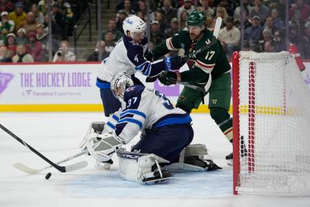 The Jets weathered an early storm from the Wild as Hellebuyck was brilliant in making 38 saves over the first two periods in a showdown of the top two teams in the NHL’s overall standings.