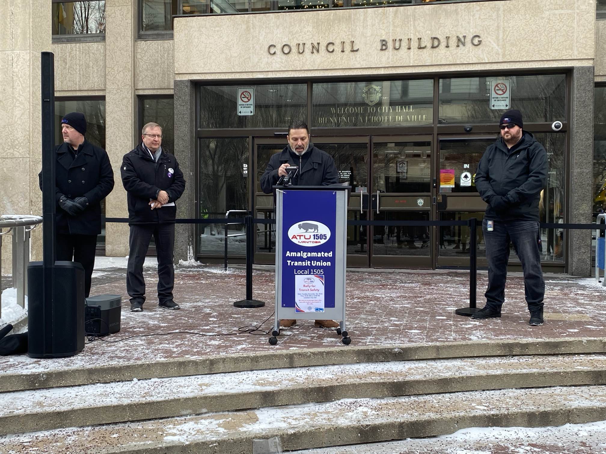 Dozens of Amalgamated Transit Union (ATU) members gathered outside city hall Tuesday morning to rally for enhanced safety measures for both drivers and riders — including fully enclosed safety shields for drivers, and more safety officers on patrol.