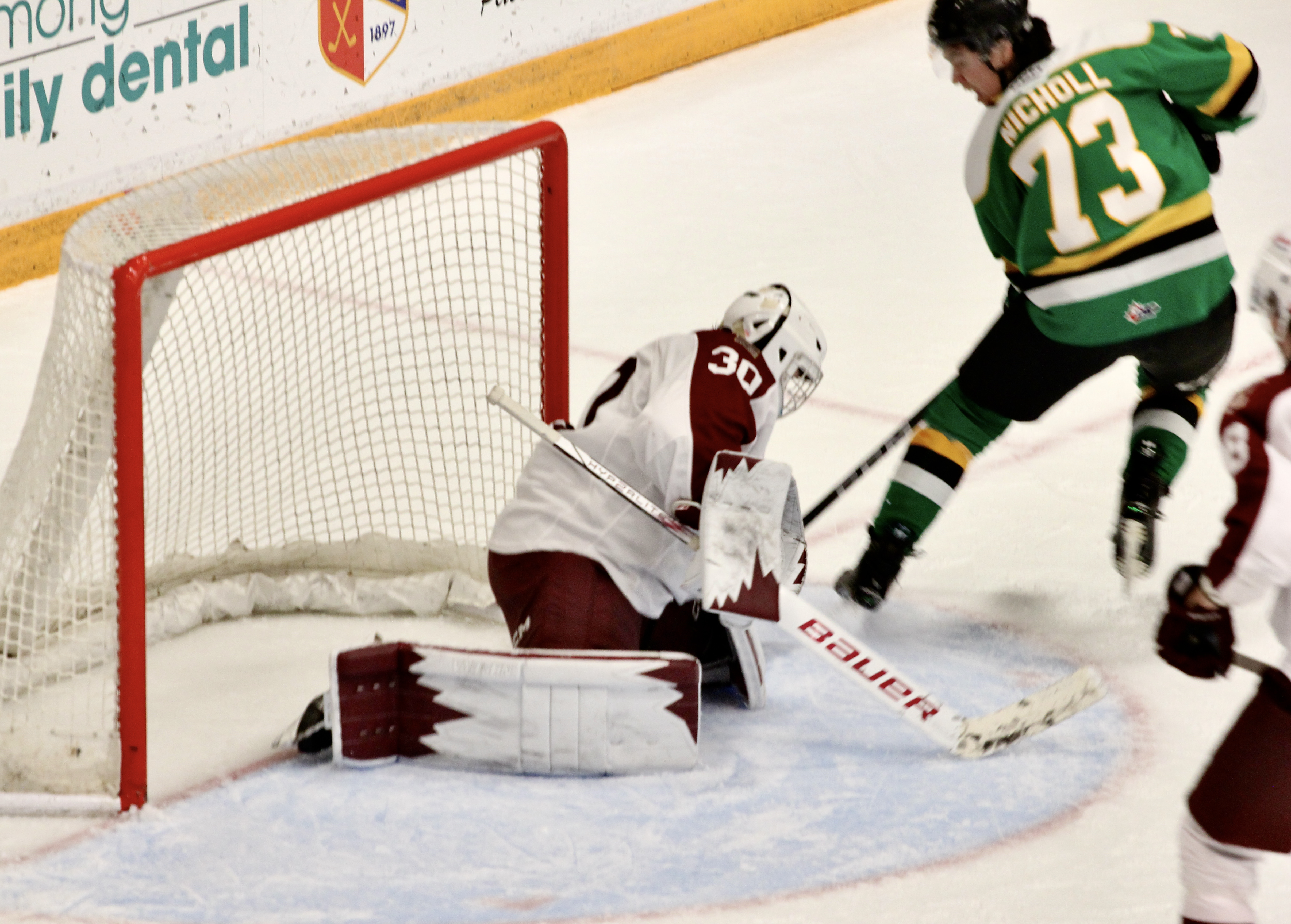 London struck twice in the second period on Nicholl’s second of the game as he was set up by Henry Brzustewicz and then on a power play goal by Landon Sim with 1:25 remaining.