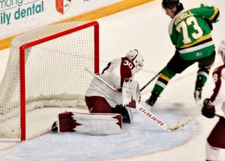 At 12:50 of the first period Sam Dickinson rifled a perfect pass through two zones to Will Nicholl who split between two defenders and slipped a backhand between the legs of Peterborough goalie Easton Rye and that made it 1-0 for London.