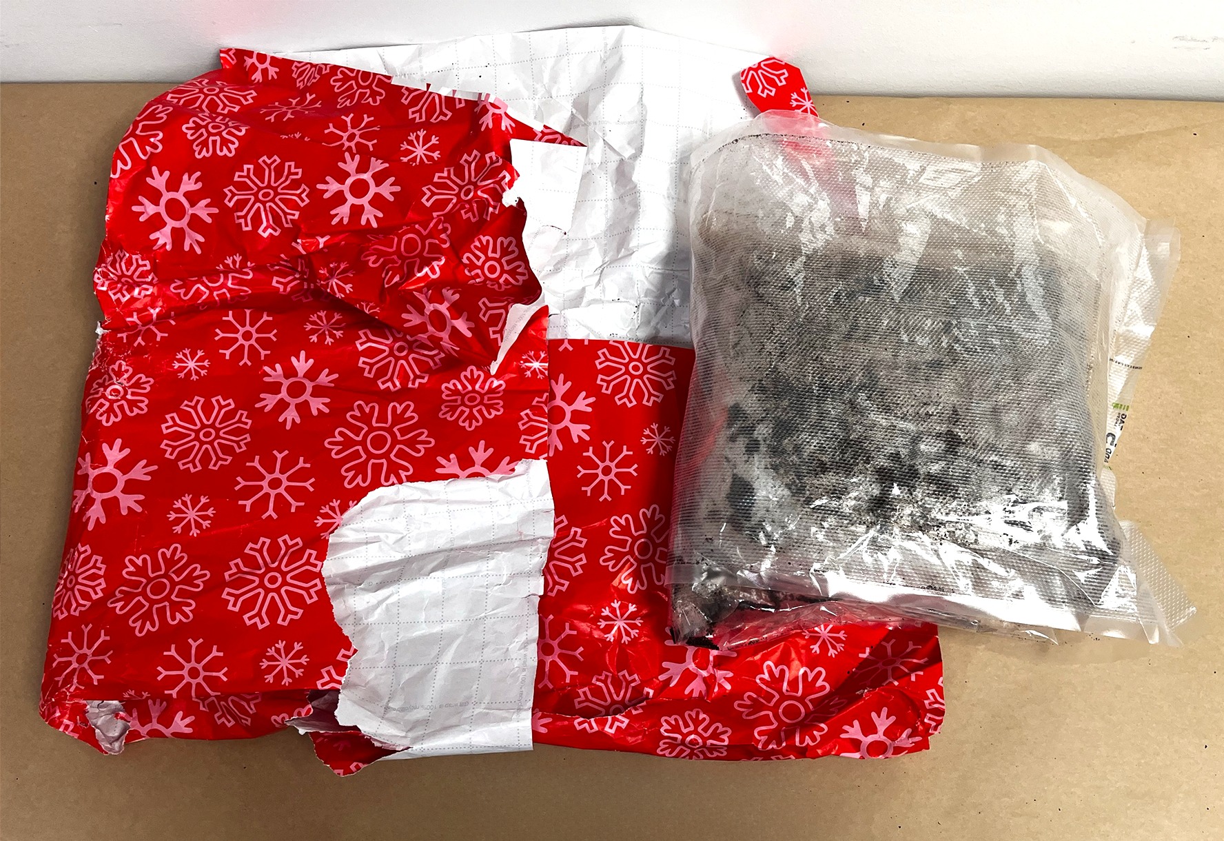 A baggage search found an estimated 10.2 kg of methamphetamine wrapped as a Christmas present.