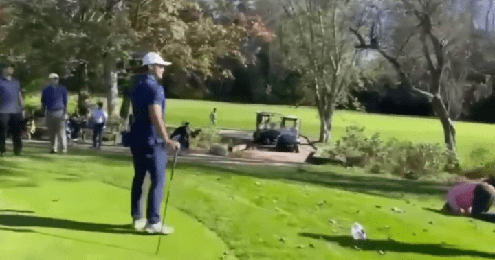 In the video, two men can be seen arguing next to a putting green, before one strikes the other with a golf club.