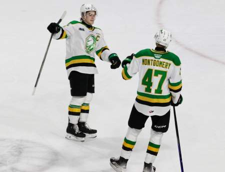 First Montgomery made two beautiful moves to get deep into the Sarnia zone, then flicked a pass to Denver Barkey and the Knights captain beat Nick Surzycia high. Logan Hawery then ripped a shot into the Sting net to push London’s lead to three goals.
