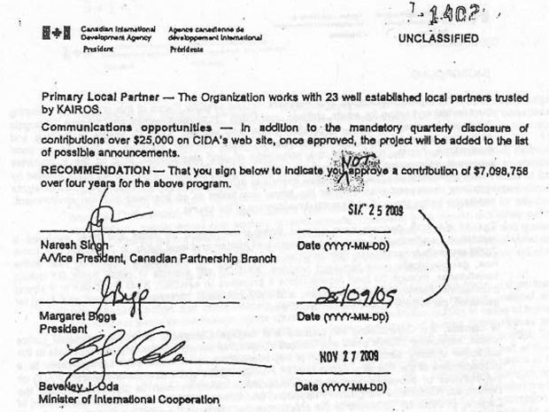 The program proposal was thoroughly reviewed by a wide range of officials from CIDA and the Department of Foreign Affairs and International Trade. They included environmental and economic policy advisers, two different program review committees and specialists in the field offices abroad. It was supported by those specialists and review committees and the official recommendation from CIDA to Minister Bev Oda was that she approve the funding. CIDA President Margaret Biggs and another top CIDA official both signed off on the memo that was sent to Oda for her signature.