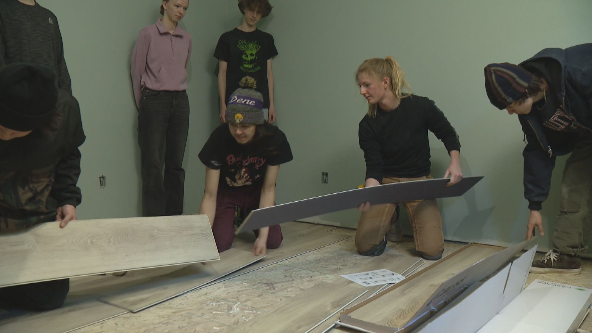 Students in the High School Carpentry Apprenticeship Program at Mount Royal Collegiate are in the process of building a house.