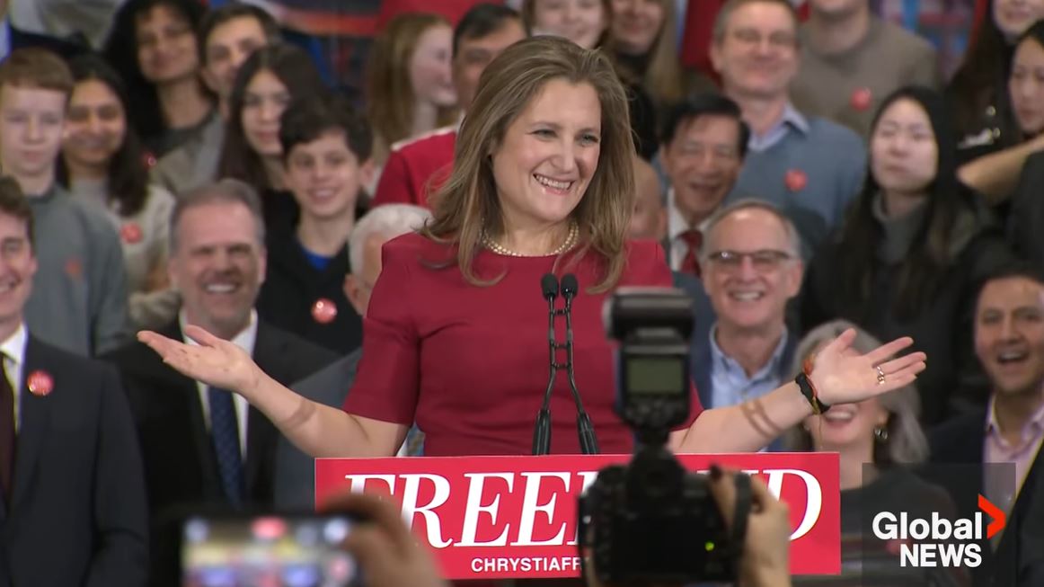 “He is afraid to fight back against people he admires. Sure he’s happy to dunk on the Liberals on Twitter. But he will never stand up to Donald Trump. He can’t even stand up to Danielle Smith,” Freeland said.