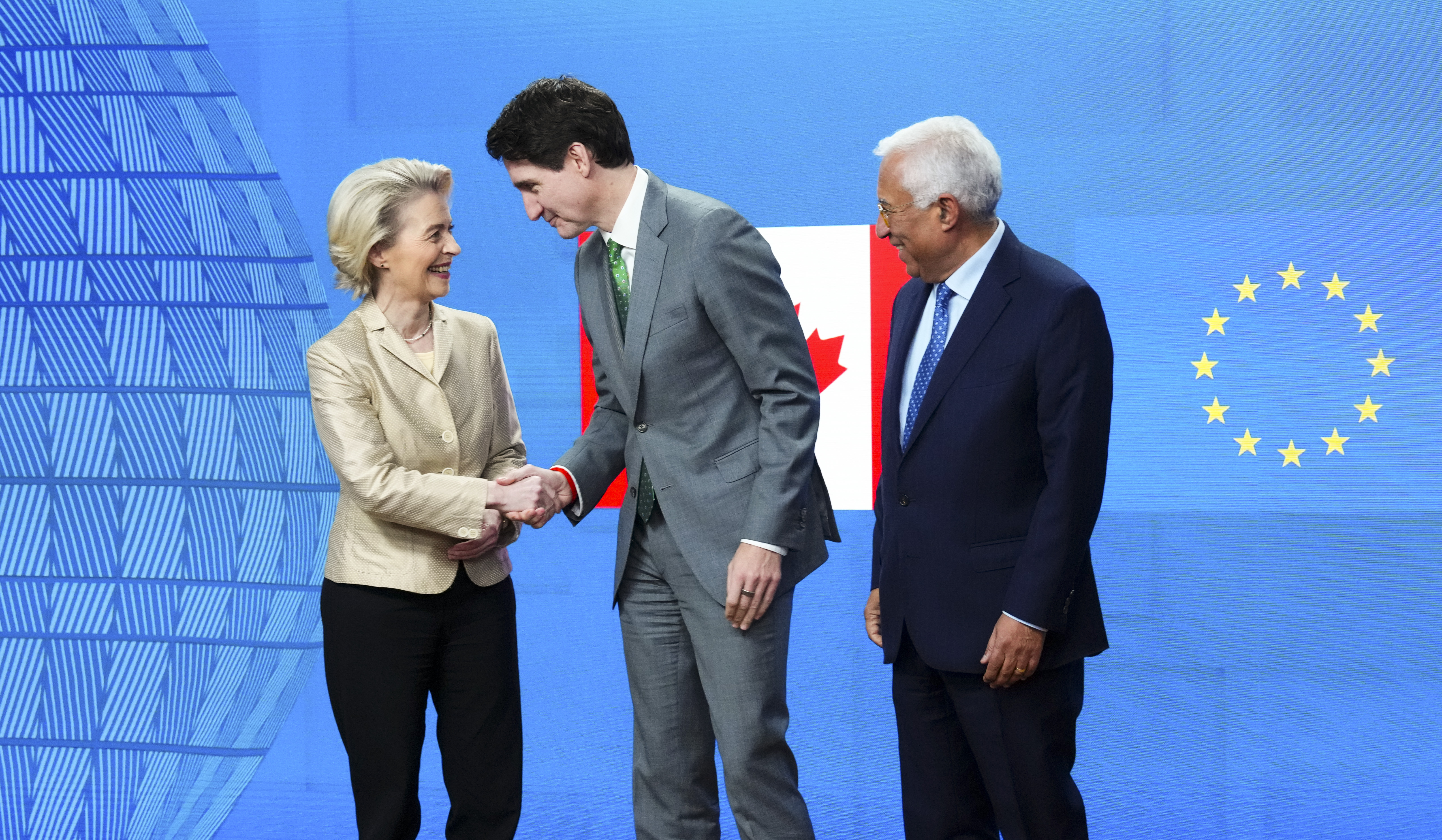 Ursula von der Leyen and Antonio Costa welcomed Trudeau at the Europa building on Wednesday afternoon.
