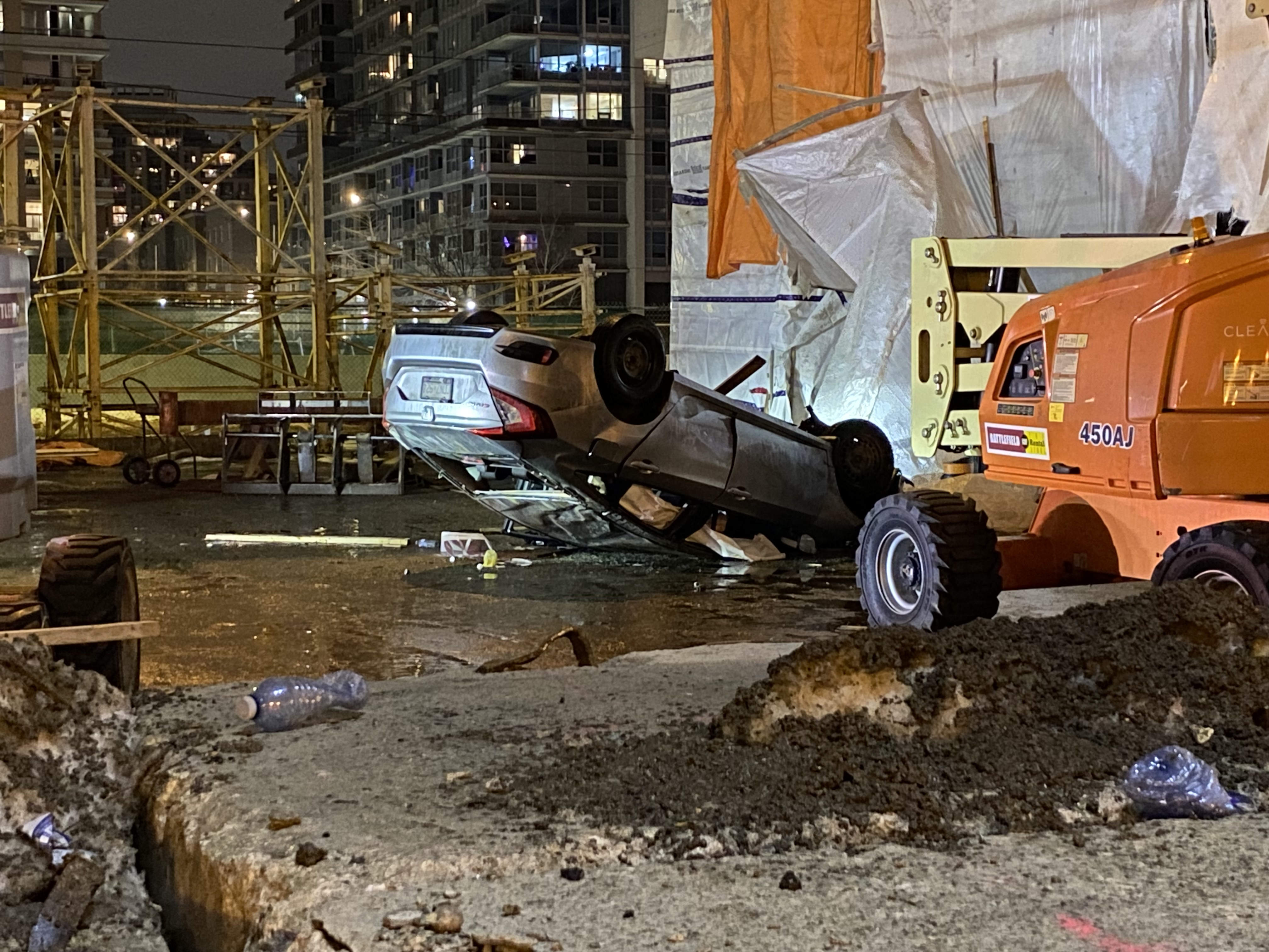 Police are investigating after a driver headed the wrong way down the Gardiner Expressway, drove into a construction site and fell into a hole causing the vehicle to flip and land on its roof.