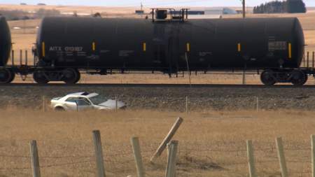 Photos and video of the scene show what appears to be a white sedan in the ditch alongside a Canadian National locomotive and a line of tanker cars.