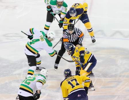 London had four players in their lineup who had five games or fewer worth of OHL experience coming into the afternoon. Two of those players – Eddie Hickson and Brody Cook – were making their Ontario Hockey League debuts.