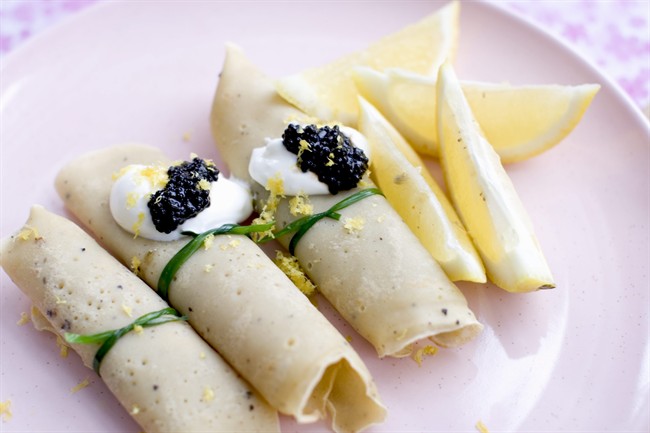 If the idea of bundling crepes into a purse filled with salmon and caviar seems daunting, you also can prepare these as rolled “cigars.” Simply add the fillings to each crepe as directed, arranging them in a line down the centre. Starting on one side, roll the crepe and fillings up, then tie across the centre with a chive.