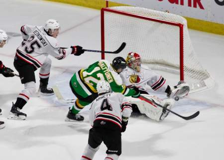 Knights goalie Austin Elliott was called on to make some key saves in the third period. George kept the puck out at the other end of the ice until an Oliver Bonk shot was stopped by George and Halttunen pounced on the rebound to score his second goal of the post season to put London ahead by a pair.