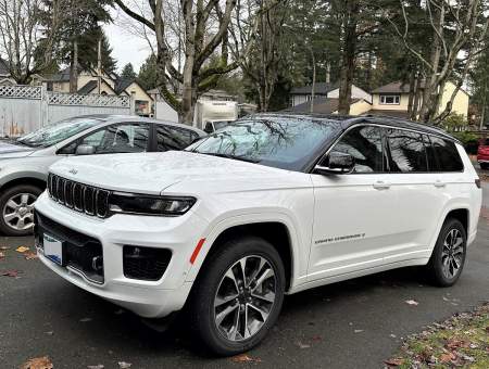 Police are looking for a stolen white 2024 Grand Cherokee and the suspect vehicle, a slightly lifted four-door white truck with no front licence plate.