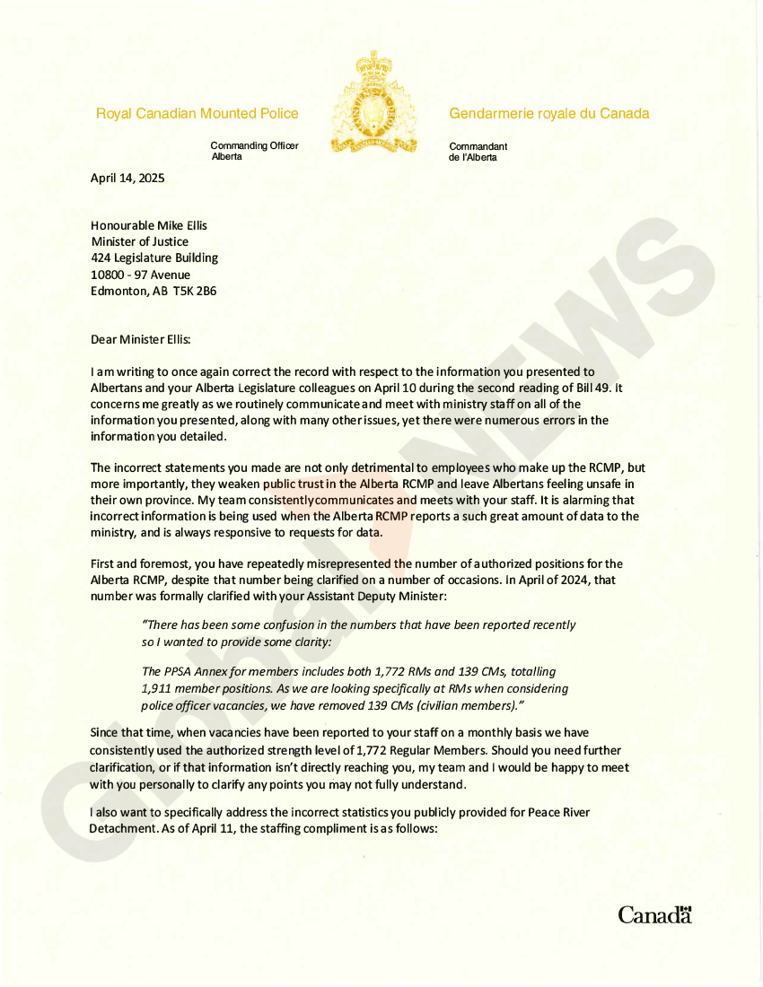 In a letter dated April 14, 2025 and obtained by Global News, RCMP Deputy Commissioner Rob Hill called it “alarming that incorrect information” was given by Ellis as he spoke in the Alberta legislature on April 10 during the second reading of Bill 49.
