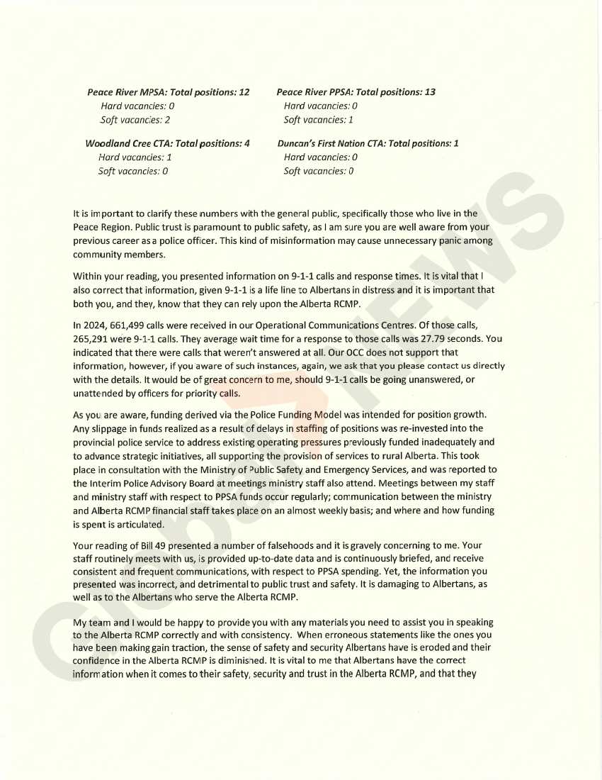 “In April of 2024, that number was formally clarified with your assistant deputy minister,” Hill wrote, noting that under the provincial police service agreement (PPSA) — which is the provincial policing contract between the governments of Canada and Alberta — there are 1,772 regular members and 139 civilian members, totalling 1,911 member positions overall.