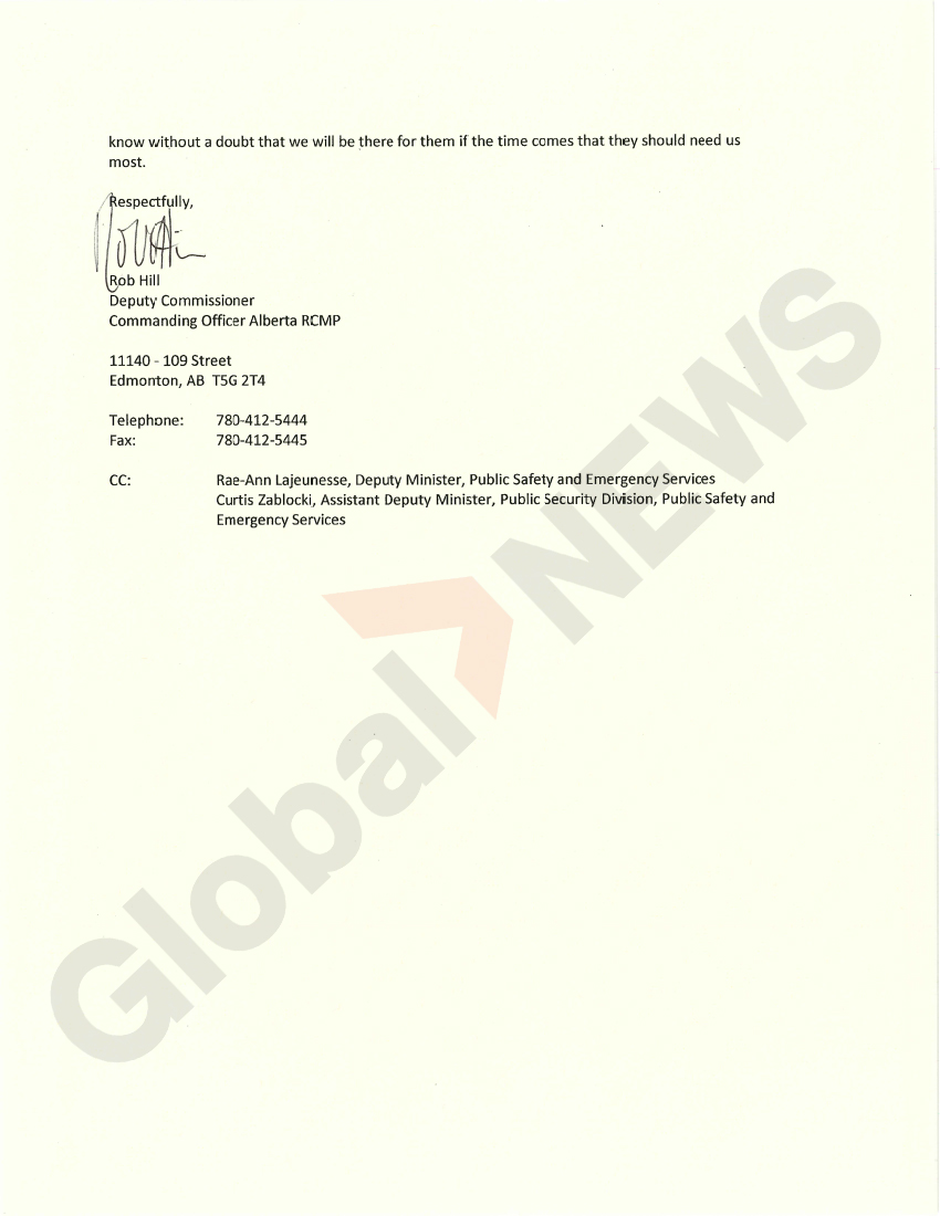 One week after the union representing Mounties sent a letter to Alberta’s public safety minister to raise concerns about his recent comments on the state of rural policing, Global News has learned the commanding officer of the RCMP in the province also sent a letter to Mike Ellis about the same issue.