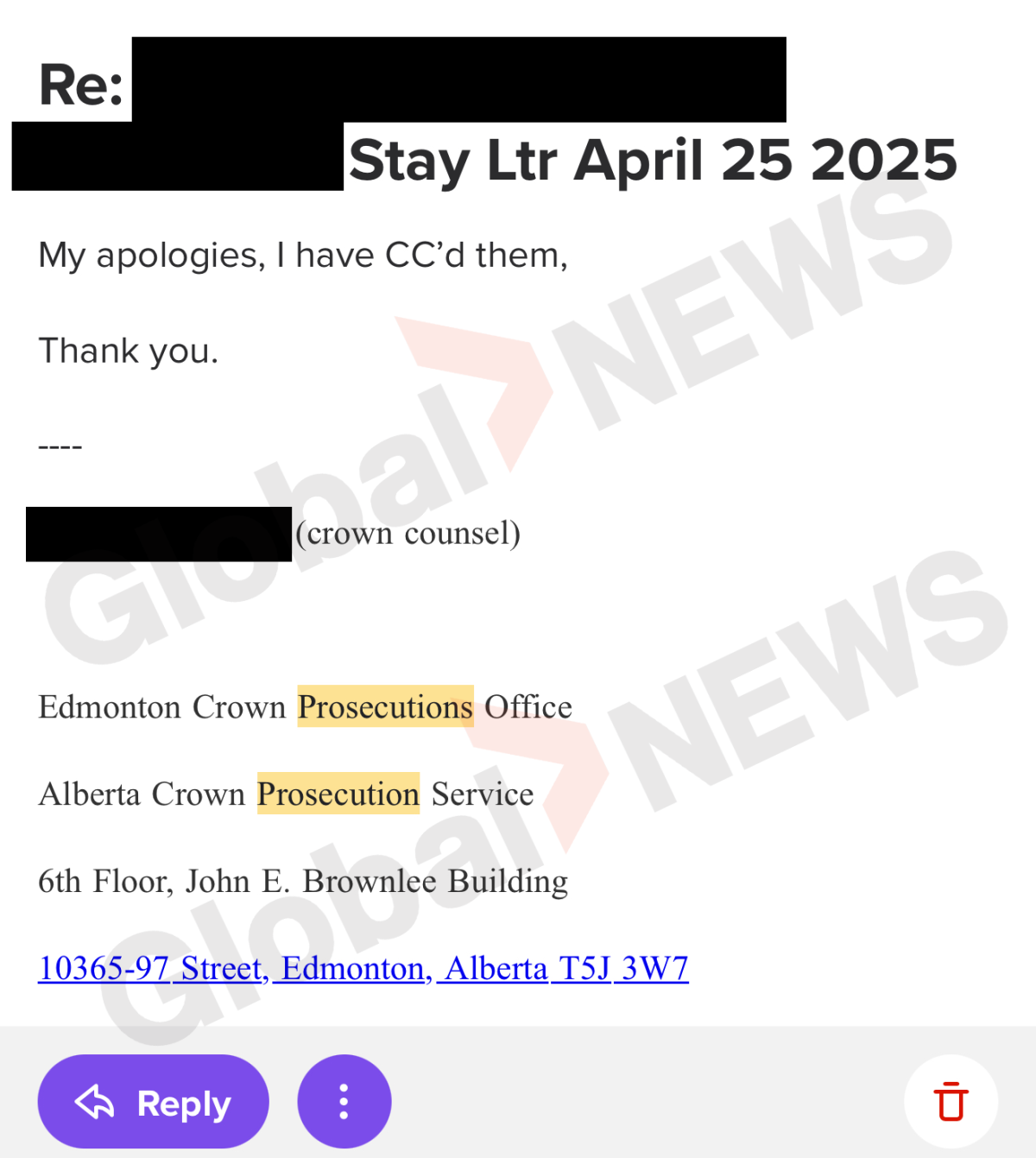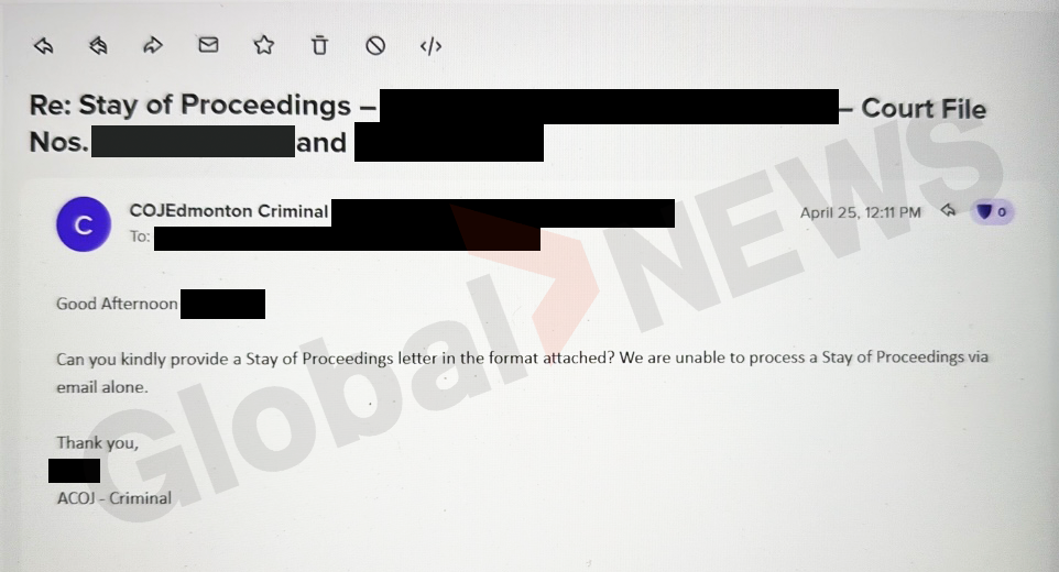 The documents sent to Global News this week include what appears to be that letter, along with court documents related to the charges and what look like interactions with people working in Alberta’s justice system.
