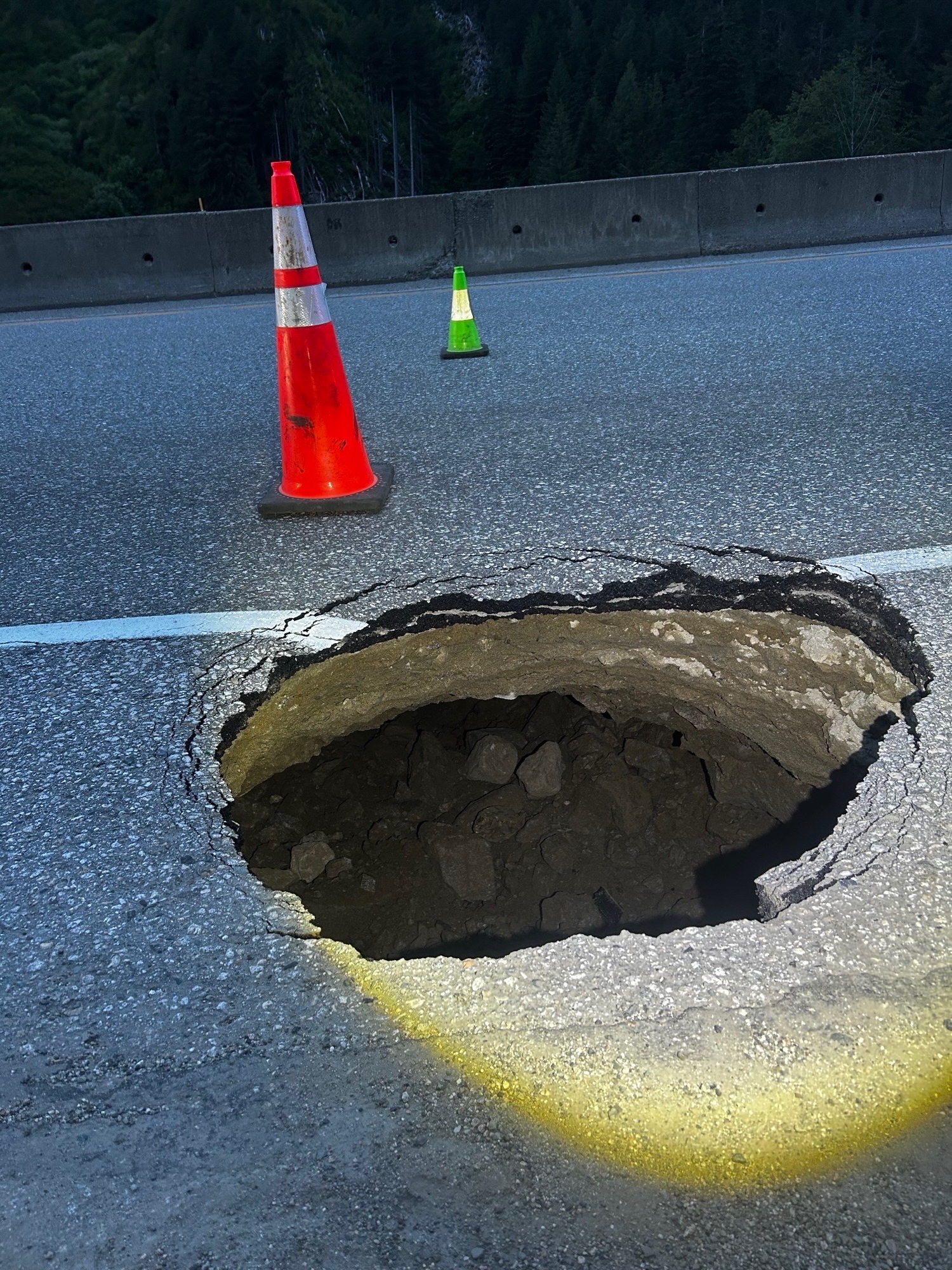 Crews appeared to have patched the hole by late Friday afternoon, but the route remains closed.