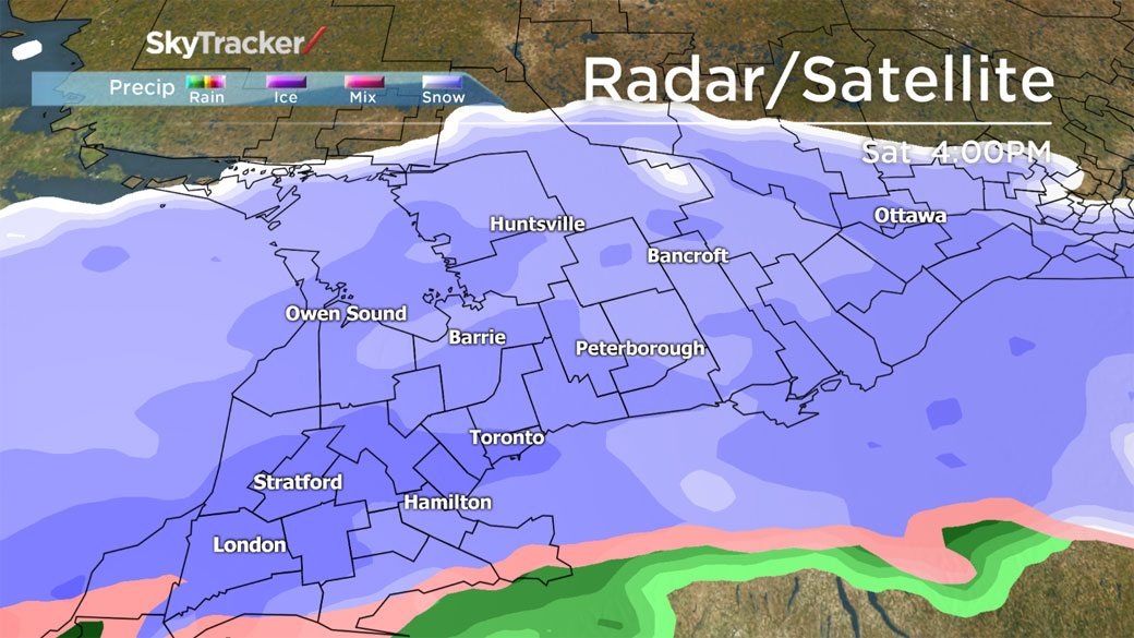 The snow will start moving into southwestern Ontario by Saturday morning. But south of a line from Sarnia through to Markham towards Kingston, the snow — which is expected to be around 5 to 10 cm — will change to rain with a risk of freezing rain. Toronto can expect about 10 cm of snow.