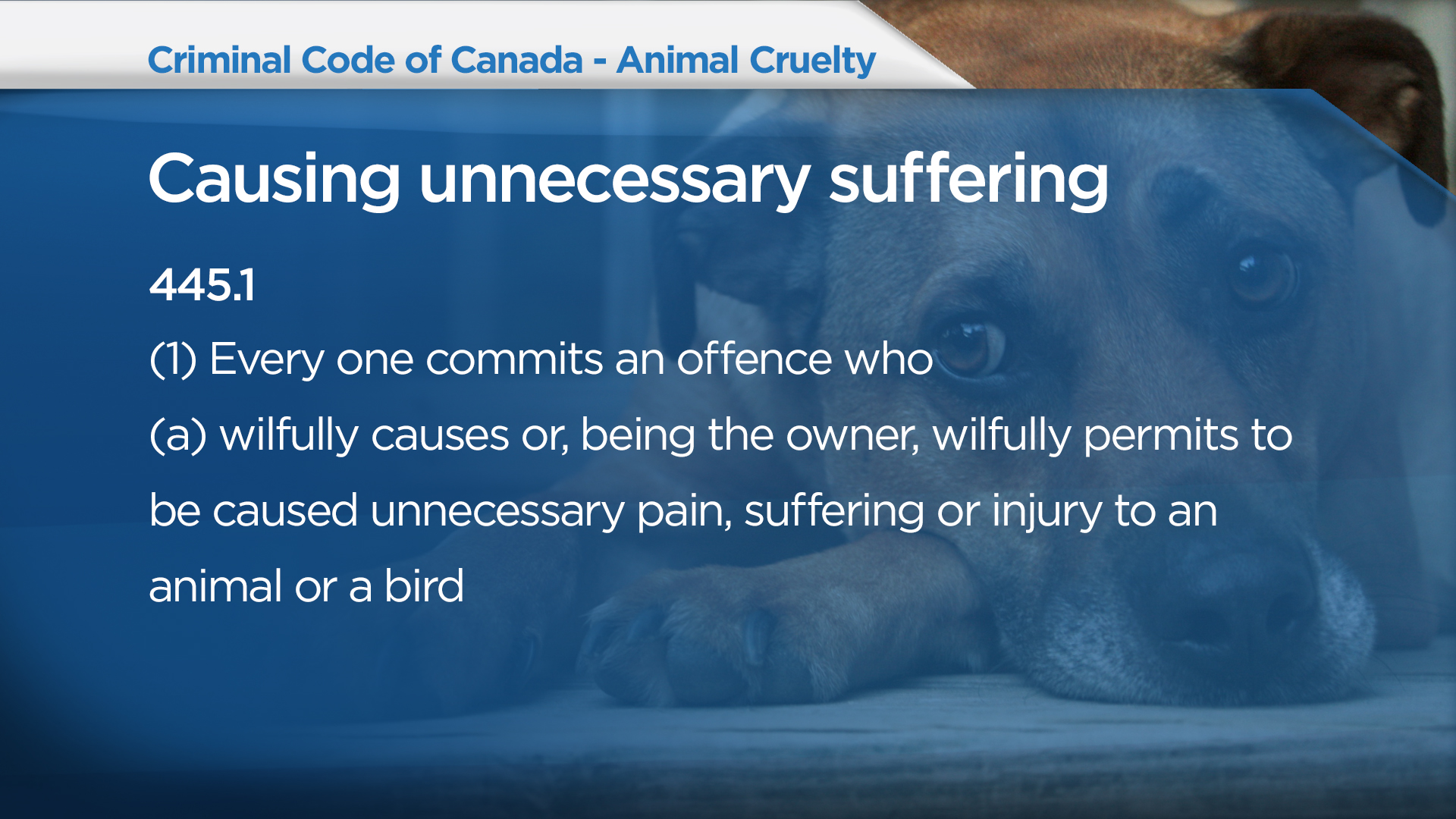 Animal cruelty is an offence when a person willfully permits pain, suffering or injury to an animal or bird—which some critics want to see changed.