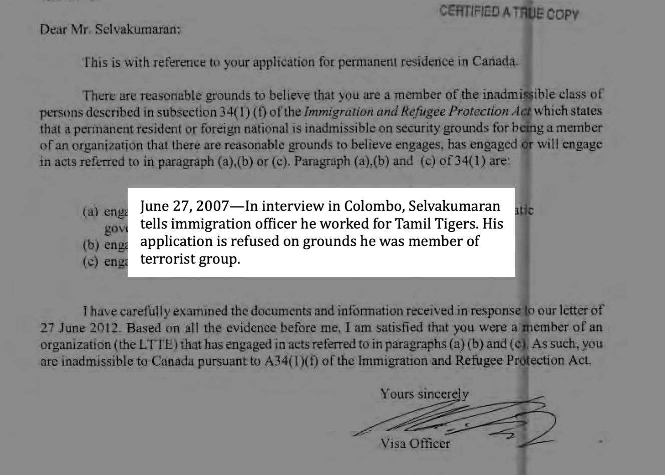 Following his rejection, Selvakumaran changed his story again. This time he said he had fabricated his account of working for the LTTE as a result of “bad advice.” He also claimed the Canadian visa officer had “intimidated” him.