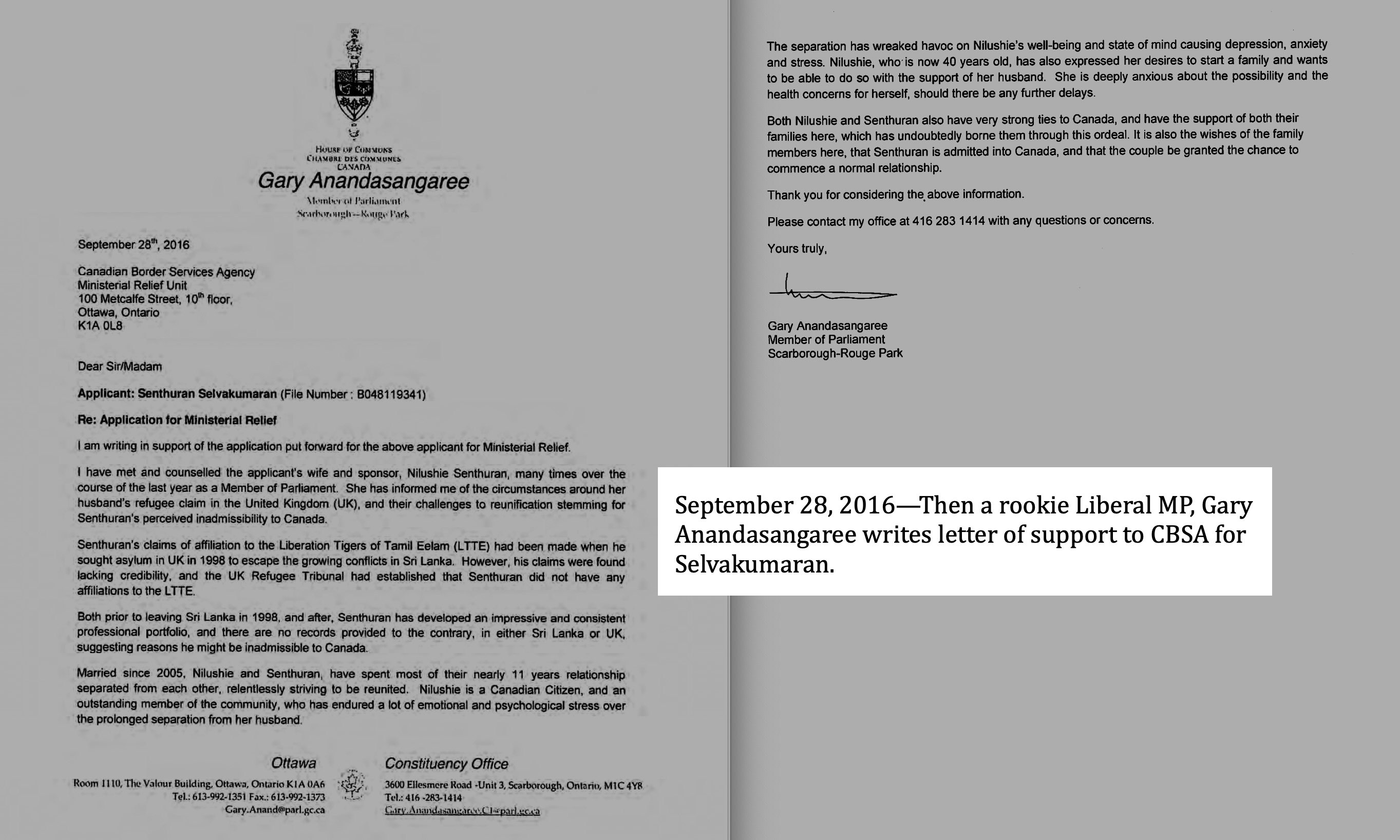 Anandasangaree had been in office for less than a year later when he penned his first support letter for Selvakumaran on Sept. 28, 2016. The court decision suggested that Selvakumaran’s wife Nilushie lived in Anandasangaree’s riding.