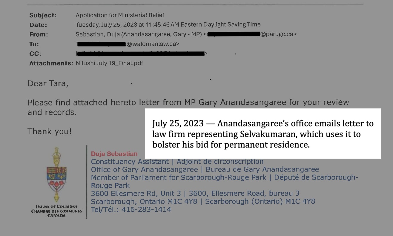 Anandasangaree’s second letter of support to the CBSA was dated during the time the immigration agency was in the final stages of deciding whether Selvakumaran qualified for ministerial relief.