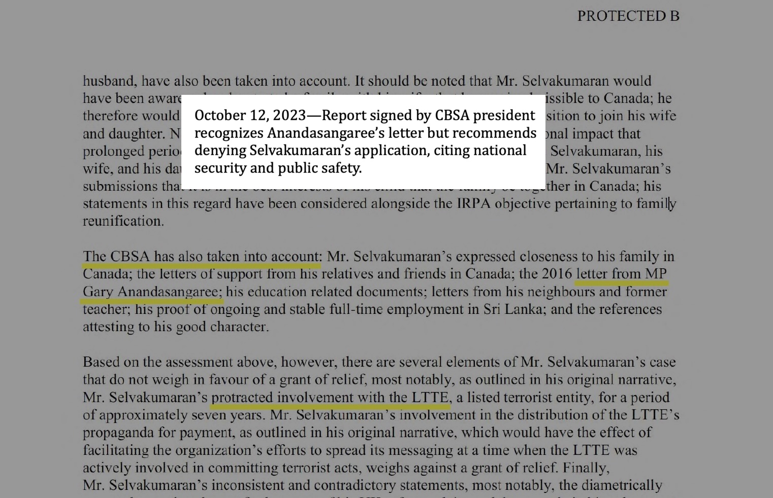 Her report mentioned a “letter from Canadian Member of Parliament Gary Anandasangaree, wherein the MP expresses his support for reunification of Mr. Selvakumaran’s family in Canada.”
