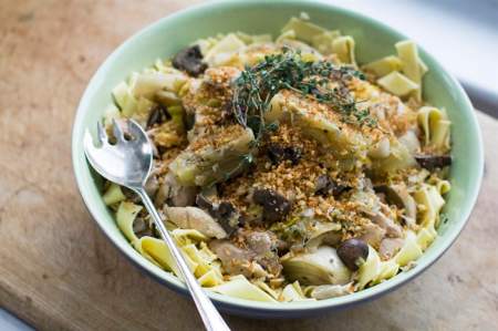 When the chicken is done, remove and discard the lemons. Adjust seasonings with additional salt and pepper, as needed. To serve, place egg noodles in the bottom of serving bowls. Spoon the chicken and vegetables over the noodles along with some of the liquid. Sprinkle with breadcrumbs.