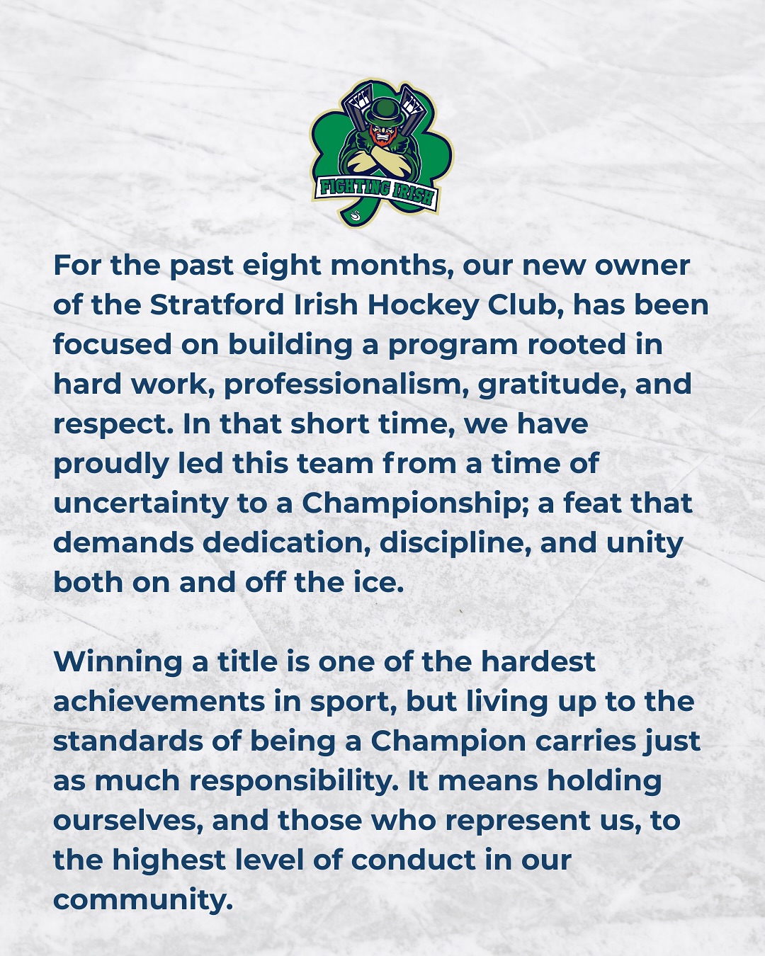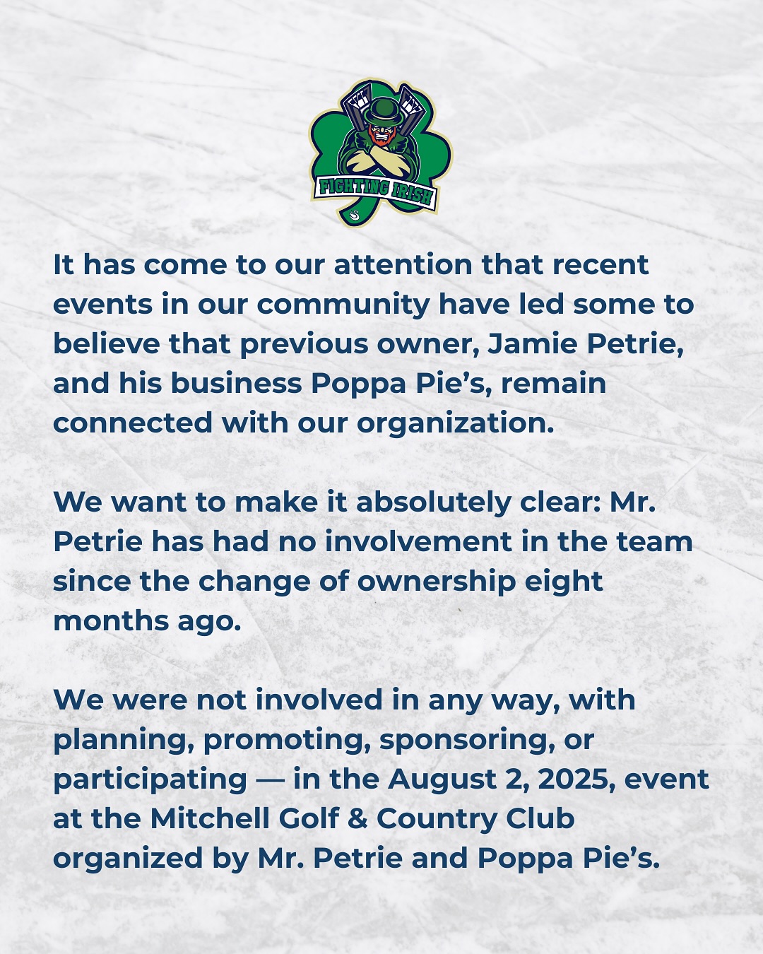 The Stratford Fighting Irish, a western Ontario Super Hockey League team, is distancing itself from Petrie, the team’s former owner.