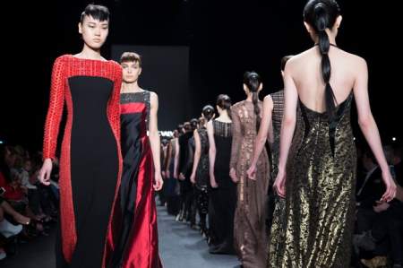 This time around, Valvo turned out a woman warrior in armour-looking gowns, down to the ground, some with chain-link accents and metal beads inspired by a recent trip to Turkey.