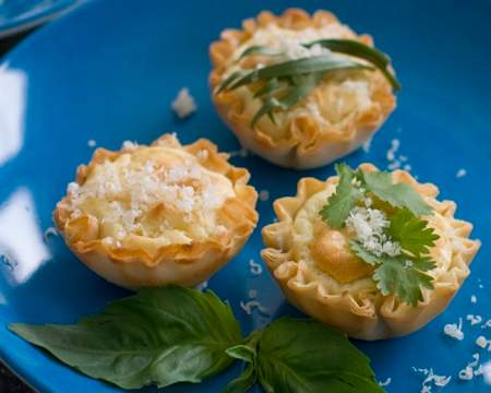And if you can’t find them pre-made, they’re easy to make at home. Just stack four sheets of phyllo dough on top of one other, lightly spritzing each sheet with olive oil cooking spray as you stack. Cut the stacked sheets into 3-inch squares, ease the stacks into the cups of a mini-muffin pan, then bake at 375 F for 8 to 10 minutes, or until they’re barely golden at the edges. Let them cool before filling and baking.