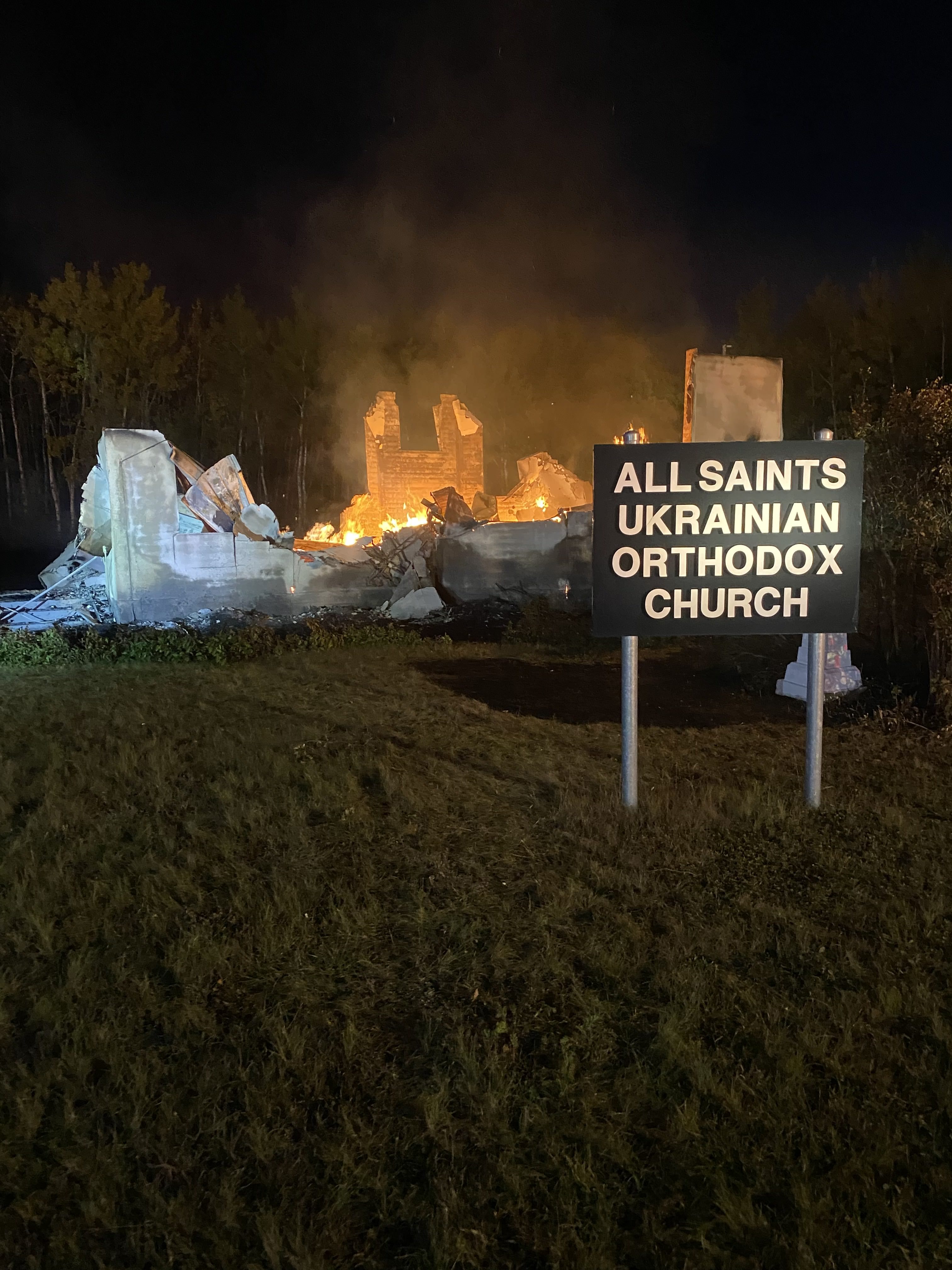 That’s all that remains of a historic Ukrainian Orthodox church in a rural Alberta community that was destroyed in a fire RCMP say was part of a crime spree.