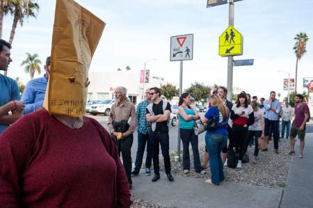 A line of more than 200 curious individuals seeking a few minutes of face time – Or should that be bag time? – with the masked 27-year-old actor snaked along the sidewalk of a busy Los Angeles street, around the block and down an alleyway Wednesday afternoon. A silent LaBeouf is brazenly on display this week for a performance-art piece titled “#IAMSORRY.”
