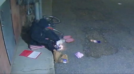 Late Tuesday evening, someone sitting near a small fire in the alley behind Gurney House of Vision in downtown Prince George was captured on security video fanning a burning piece of paper near the shop’s back door and gas meter.