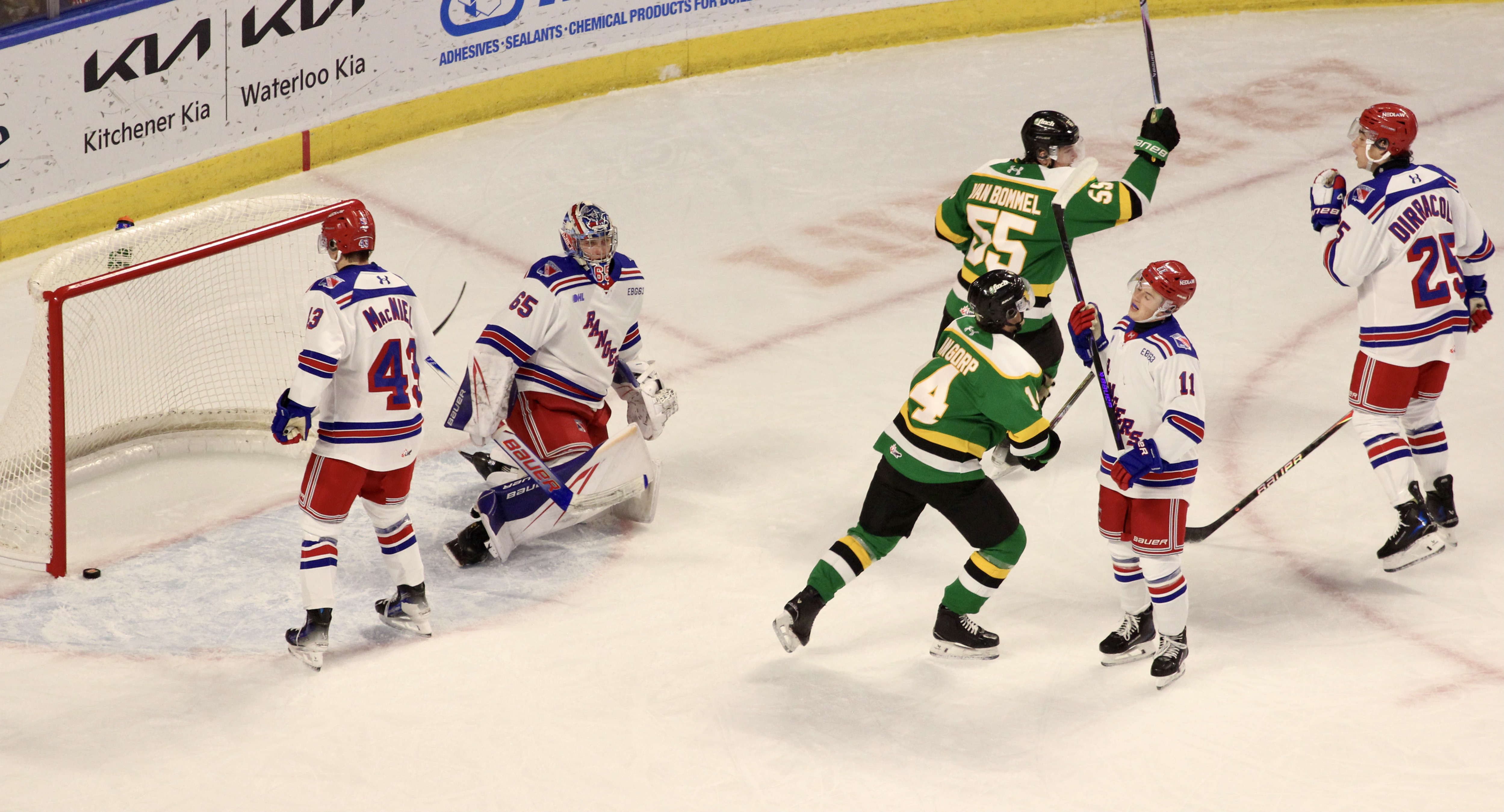 Ben Wilmott’s fifth goal in four games for the Knights made it 4-0 at 8:17 and then Kaeden Hawkins made a beautiful pivot at the side of the Ranger net and roofed his first goal in the OHL to give London a 5-0 advantage through 40 minutes.