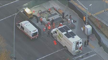 Video shot from the Global News helicopter showed emergency crews surrounding an open manhole in the area with a ladder extending down into the manhole.