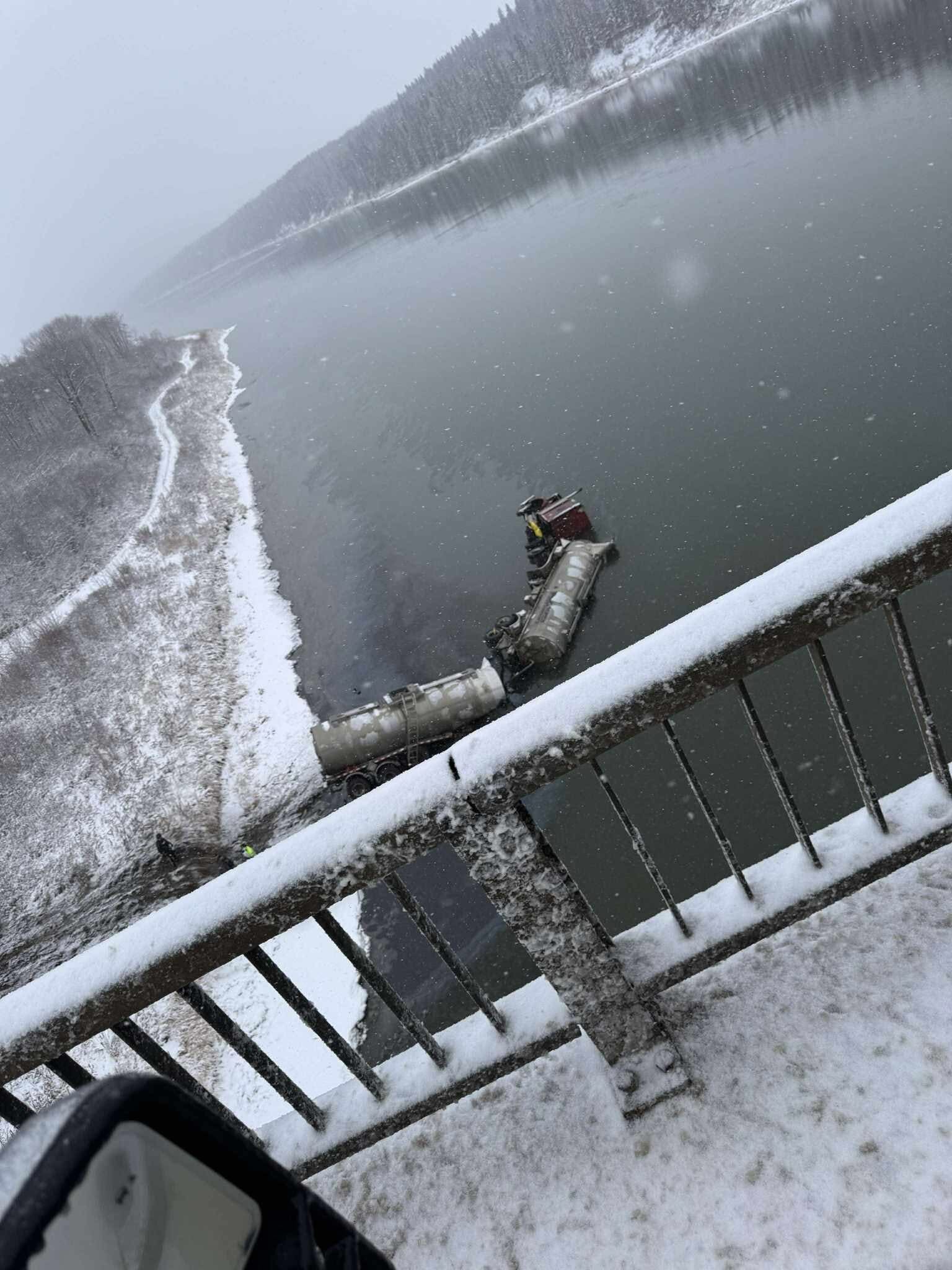 RCMP said poor road conditions led to a semi tanker hauling suspected bitumen losing control and crashing into the North Saskatchewan River downstream of Edmonton.