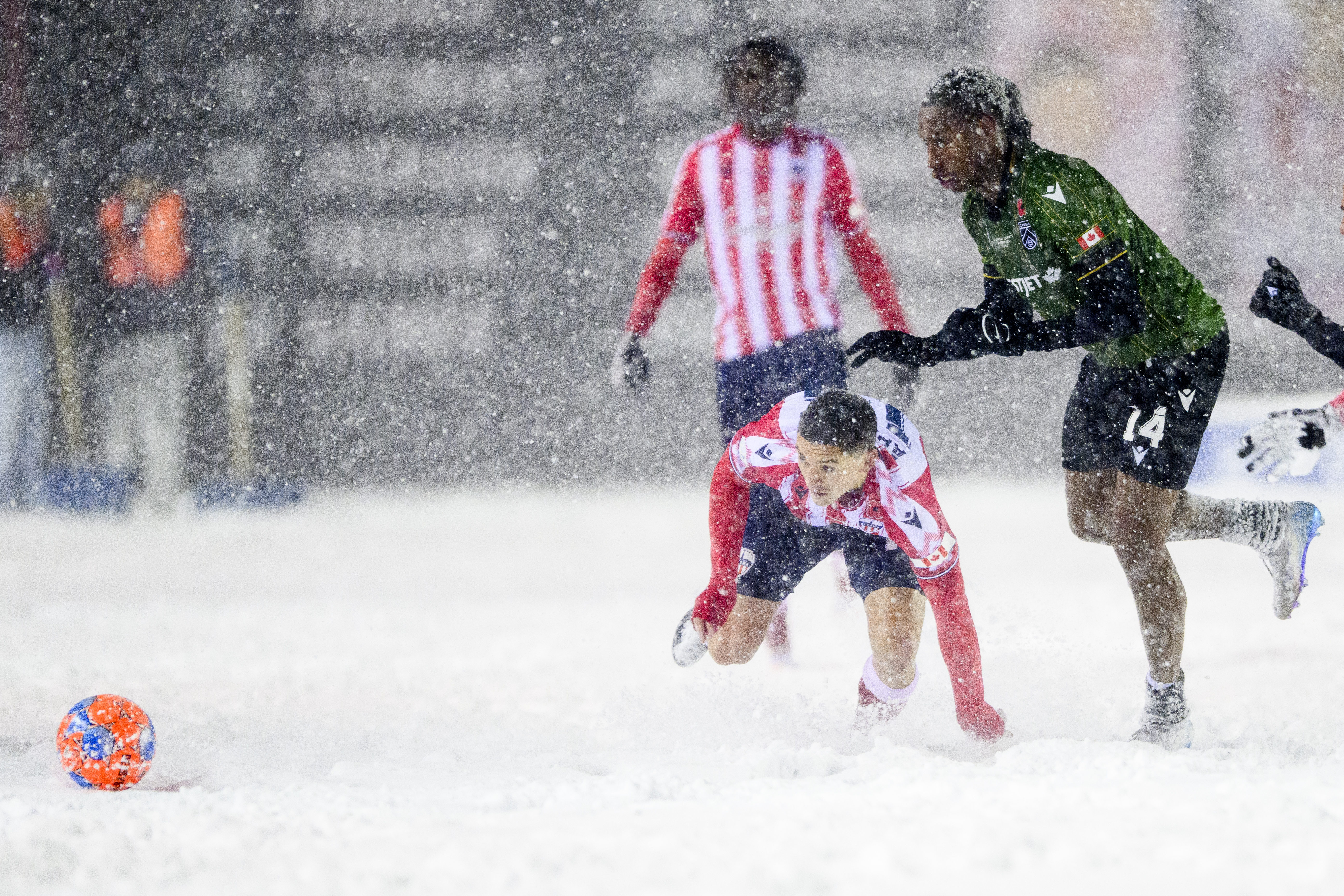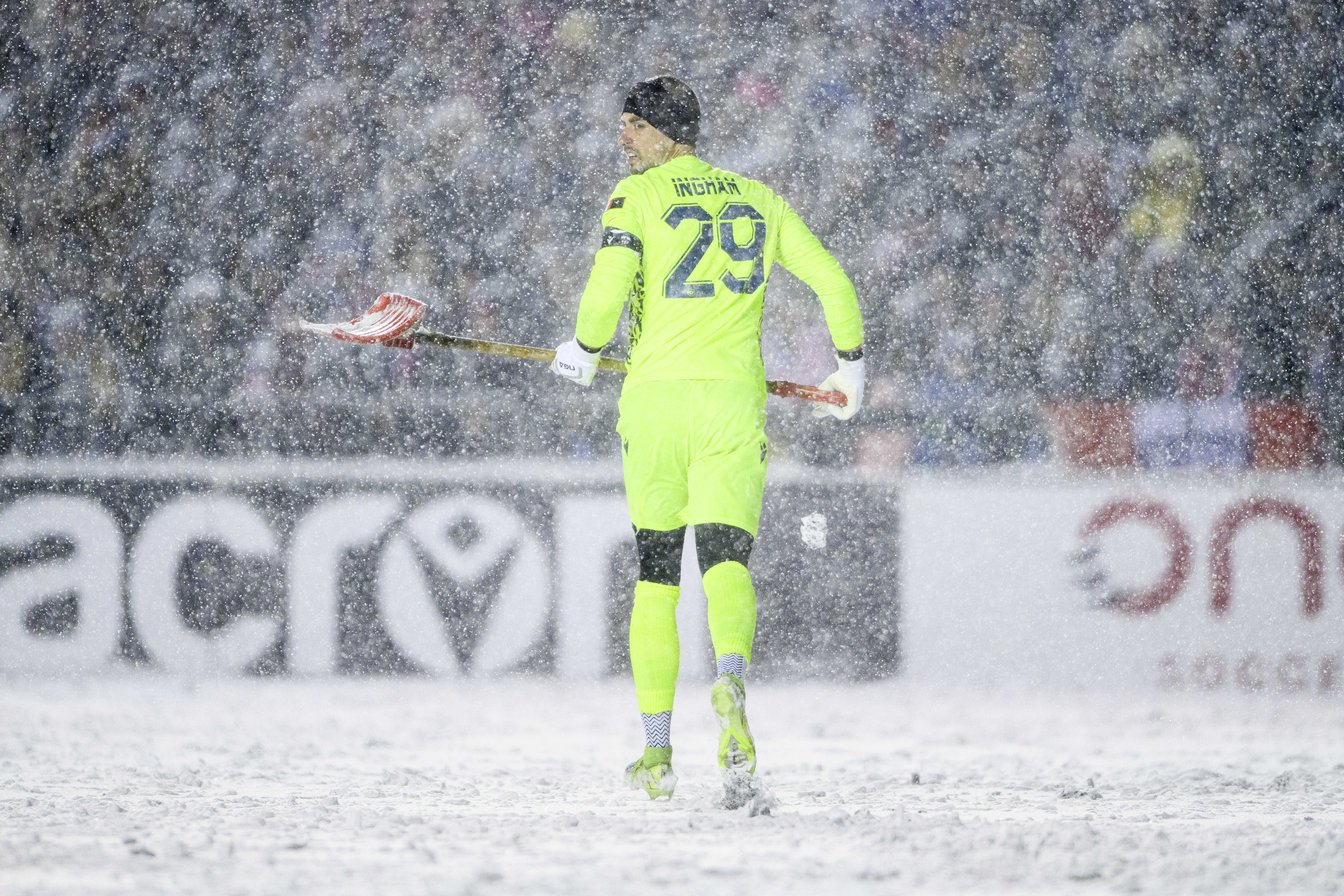 At one point in the frame, Atlético Ottawa goalkeeper Nathan Ingham grabbed a snow shovel during a break in play to help officials clean the pitch lines.