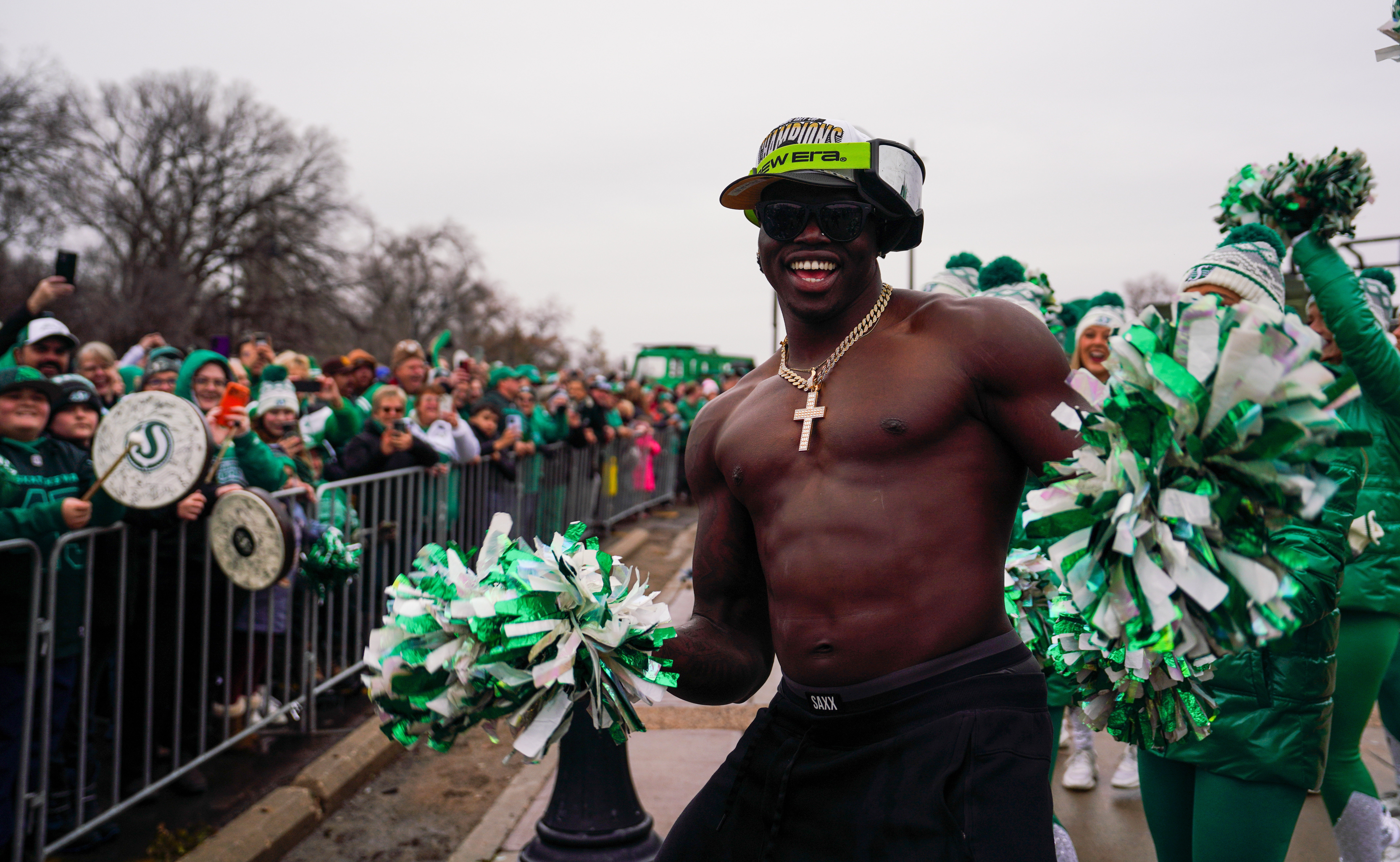 Offensive lineman Logan Ferland took the mic on arrival, thanking everyone for their support.