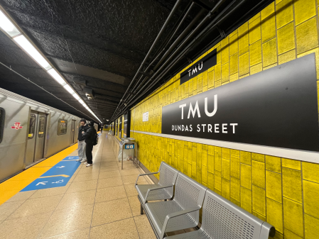 On Tuesday, the temporary signs reading “TMU: Dundas Street” could be seen around the station, part of a rebrand to name it after Toronto Metropolitan University.